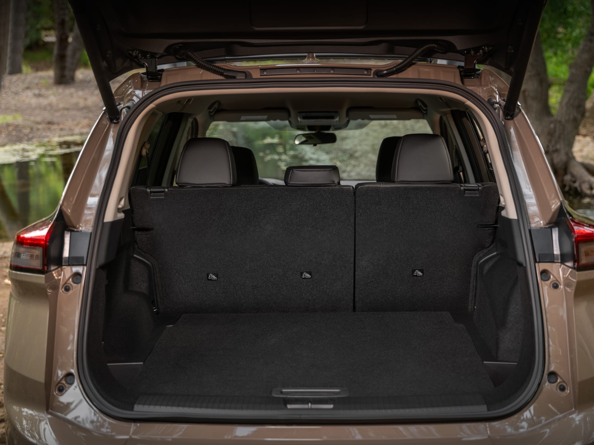 Inside, the Rogue seats five with premium cloth or available leather-appointed seats, including heated and ventilated front seats on higher trims. Rear passengers enjoy generous legroom, storage pockets, and easy access to multiple USB charging ports. Cargo expands to roughly 74 cubic feet with the rear seats folded, complemented by a wide opening and available Hands-Free Liftgate for easy loading. Comfort and convenience features like dual-zone climate control, a leather-wrapped steering wheel, and ambient lighting round out a practical, modern cabin for daily drives.